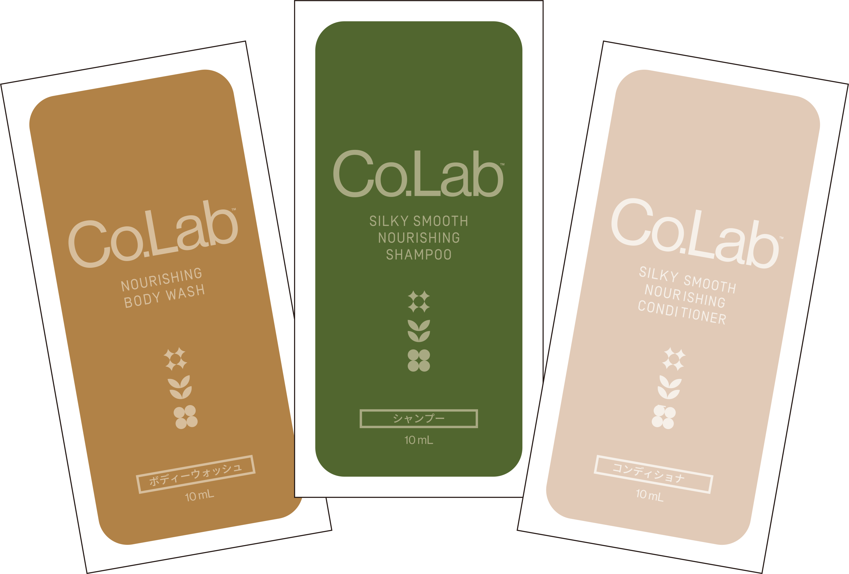 今秋新登場「Co.Lab」シリーズのシャンプー・コンディショナー・ボディーウォッシュの個包装パウチセット。ご紹介やプレゼント、旅行のお供にもぴったり!