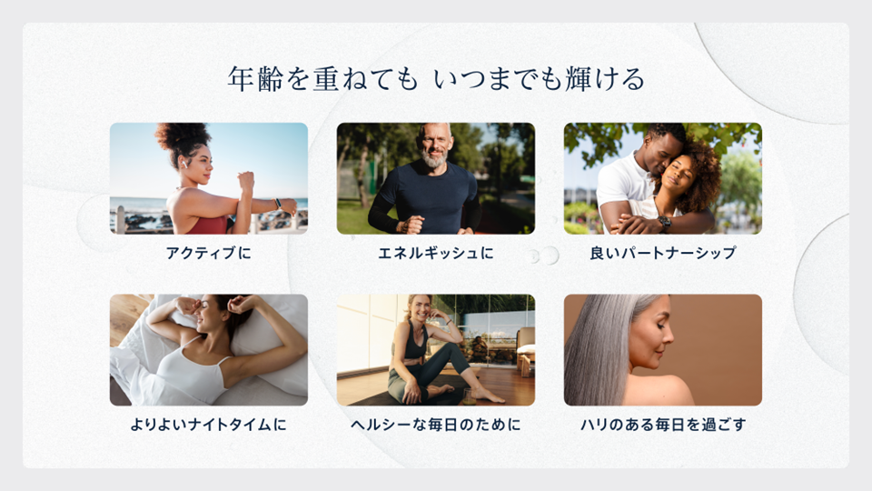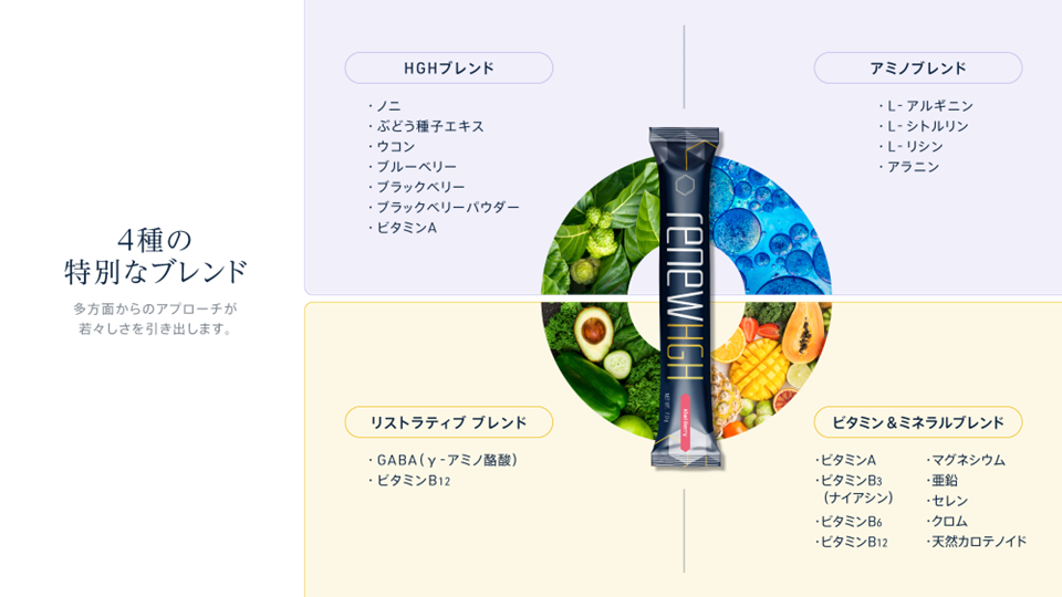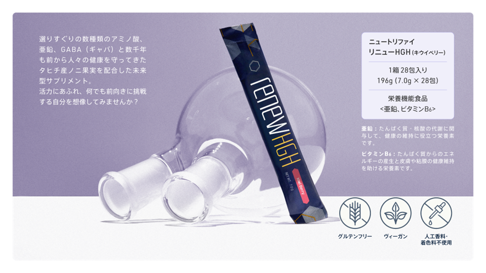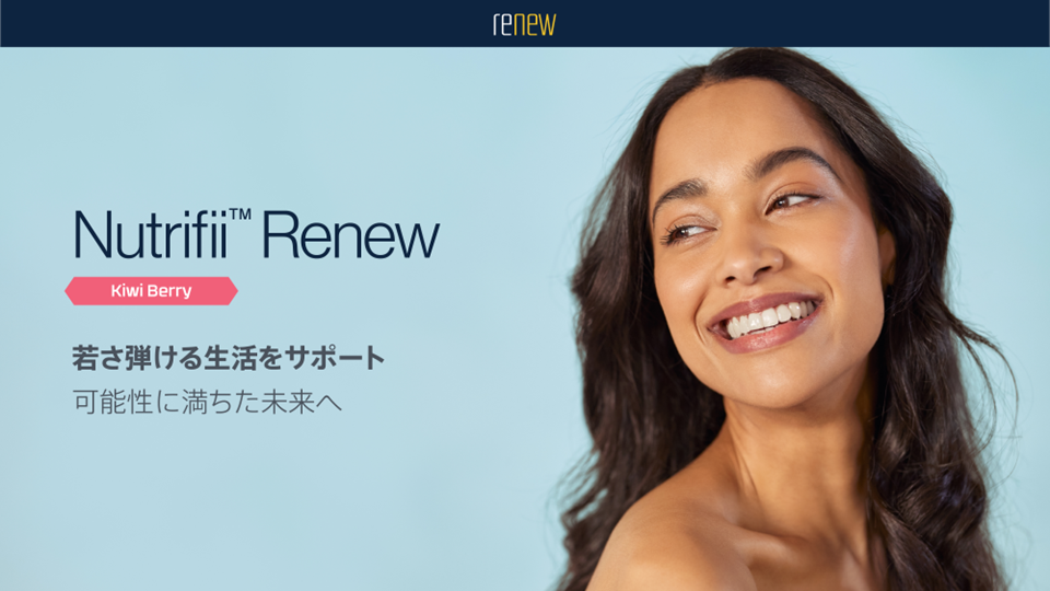 忙しい毎日の中でも、心地よく、自分らしく過ごしたい—— そんな想いに寄り添うエイジングケア発想の未来型サプリメントが、リニューHGH(キウイベリー)です。
