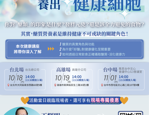 課程主題:從「醣」開始,養出健康細胞✨ 特邀腸道功能權威「王輝明 醫師」親自演講 🔥活動當日還有現場專屬優惠,絕對不能錯過! 👨⚕️重磅主題搶先看: ✅ 醣質的真實角色與功能✅ 為什麼「好醣」對健康優化至關重要✅ 如何透過日常飲食正確攝取醣質,活化健康力 📍三場講座任你選 活動時間:14:00(1…