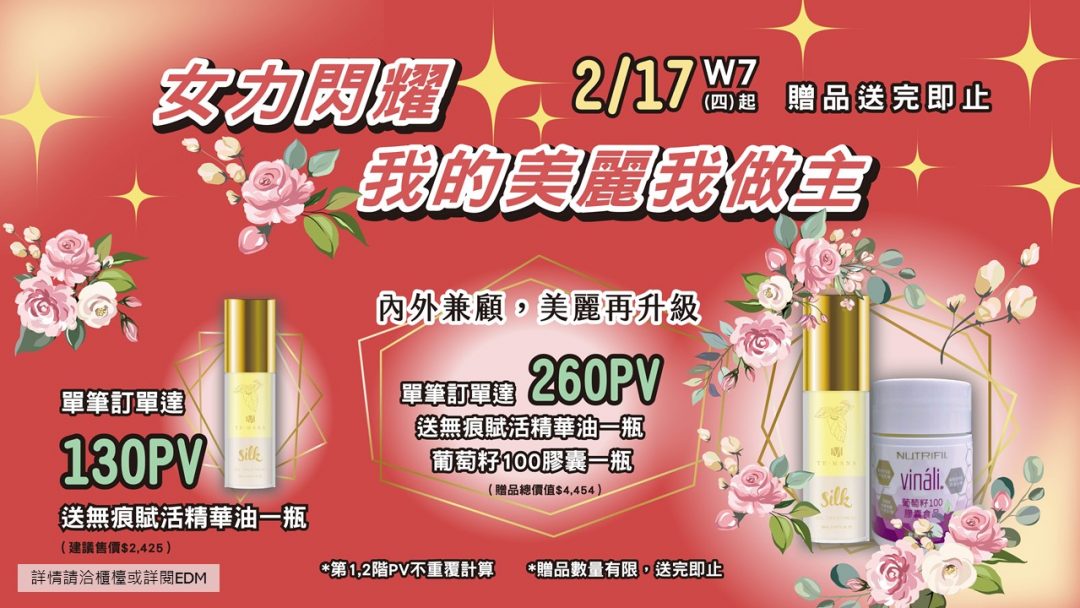 女力閃耀 我的美麗我做主~滿額贈「無痕賦活精華油」優惠活動現正進行中,立馬下單 ,就有機會免費獲得! 營業時間洽☎0800-081988