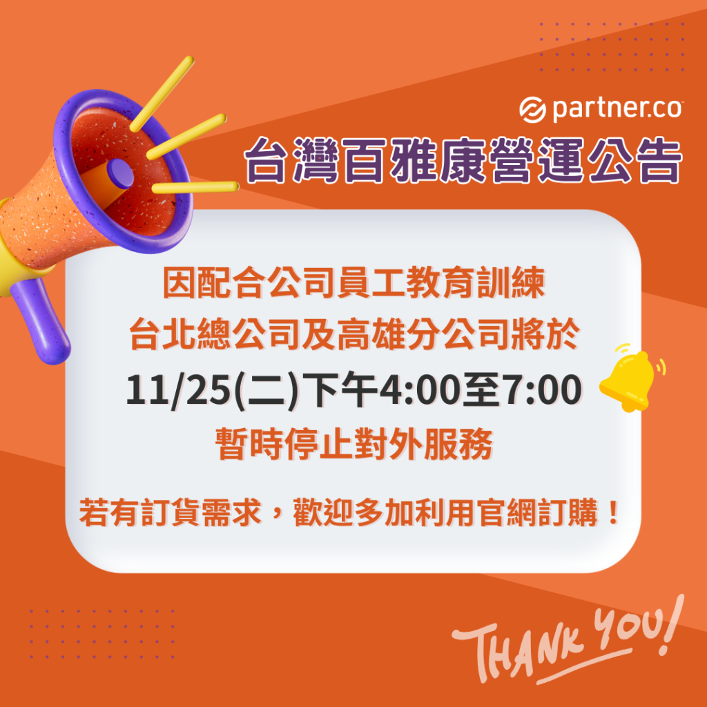 公司訊息 【11/25(二)營業時間調整公告】 發布日期 November 21, 2025 為因應百雅康公司員工教育訓練課程,台北總公司及高雄分公司將於11/25(二)下午4:00至7:00暫停對外服務,造成不便敬請見諒🙏 若有訂貨需求,歡迎多加利用官網訂購🛒我們將持續為您提供最好的服務,謝謝您的理解與支持❤️