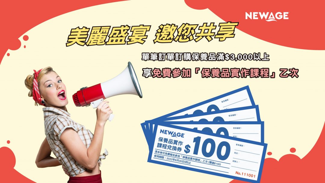 公司訊息 美麗盛宴 邀您共享 發布日期 January 26, 2022 自即日起至4月29日(五)止,凡單筆訂單訂購新世紀保養品滿$3,000以上,即可獲贈「保養品實作課程兌換券乙張」以此類推(註),憑兌換券可免費報名參加「保養品實作課程」乙次,敬請把握!