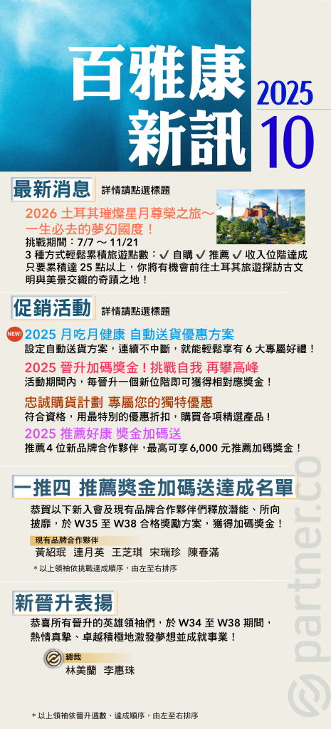公司訊息 📣【百雅康新訊2025年10月號】出刊囉! 發布日期 October 1, 2025 ✨本期精彩內容:多項事業好康獎勵計劃火熱進行中👍、推薦獎金達成名單、領袖榮譽榜👑…等 🔆掌握最新訊息,立即點閱 https://lihi3.me/aMzlb👏