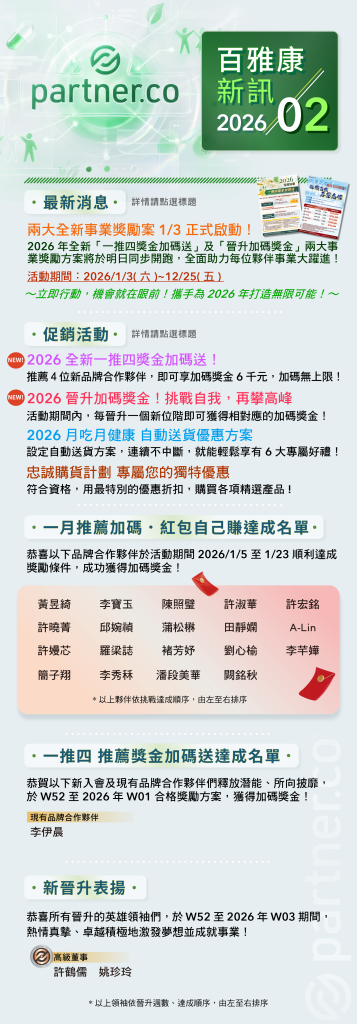 公司訊息 📣【百雅康新訊2026年2月號】出刊囉! 發布日期 January 30, 2026 ✨本期精彩內容:多項事業好康獎勵計劃火熱進行中👍、推薦獎金達成名單、領袖榮譽榜👑…等 🔆掌握最新訊息,立即點閱:https://lihi3.me/WFabw