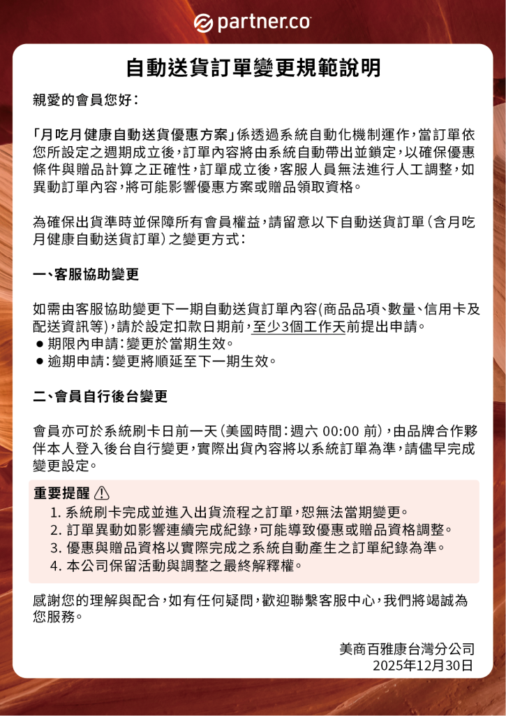 為確保自動送貨訂單之出貨流程順暢與會員權益,針對自動送貨訂單(含月吃月健康自動送貨訂單),以下整理訂單變更之重點說明,提醒您留意變更的時間與方式,以避免影響活動或贈品資格。