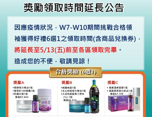 因應疫情狀況,為保護您的健康安全,凡於W7-10期間合格1帶4之領袖,獎勵領取時間將延長至5/13(五)前至各區領取完畢。鼓勵您與夥伴們持續挑戰,為自己贏得更多收入與獎勵! …