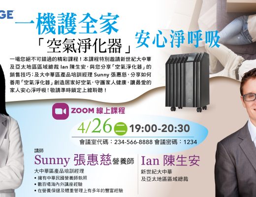本課程特別邀請新世紀大中華及亞太地區區域總裁Ian陳生安,與您分享「空氣淨化器」的銷售技巧;及大中華區產品培訓經理Sunny張惠慈,分享如何善用「空氣淨化器」創造居家好空氣,守護家人健康,讓最愛的家人安心淨呼吸!…