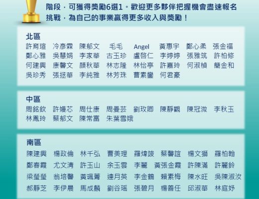 全台已有近80權挑戰成功獲得獎勵,鼓勵夥伴再接再厲,贏得更多收入與獎勵!同時鼓勵想要衝刺事業、拓展事業版圖的夥伴們,立即填寫專屬挑戰書,開始挑戰!…
