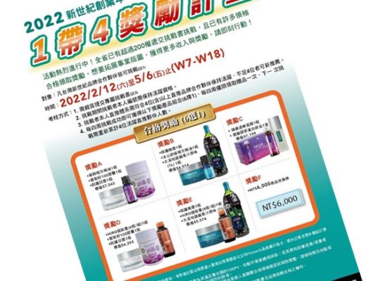 自2/12(六)-5/6(五) (W7-W18)期間,完成填妥並遞交挑戰書,即可開始挑戰1帶4獎勵計畫,就有機會獲得獎勵6選1!…