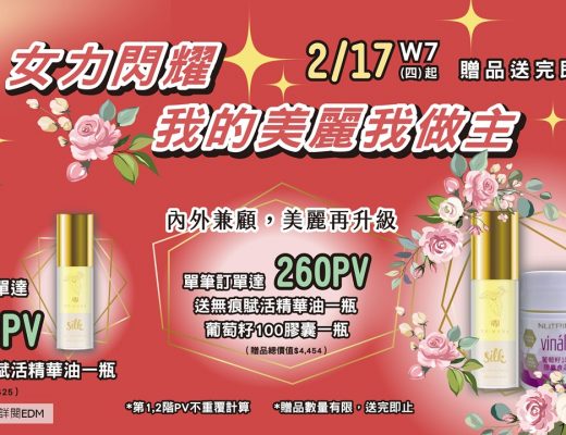 2/17(四)W7起,單筆訂單達260PV,送無痕賦活精華油+葡萄籽100膠囊各一瓶,讓你內外兼顧,美麗再升級…